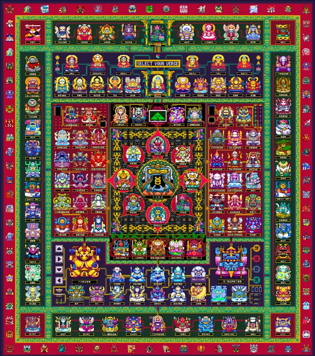A mandala filled with yokai and digital avatars traces the contours of a world where the sacred takes the shape of a video game.
